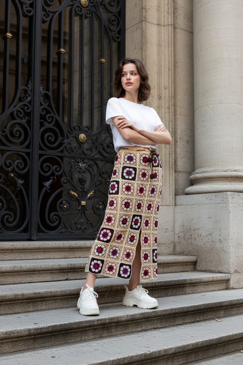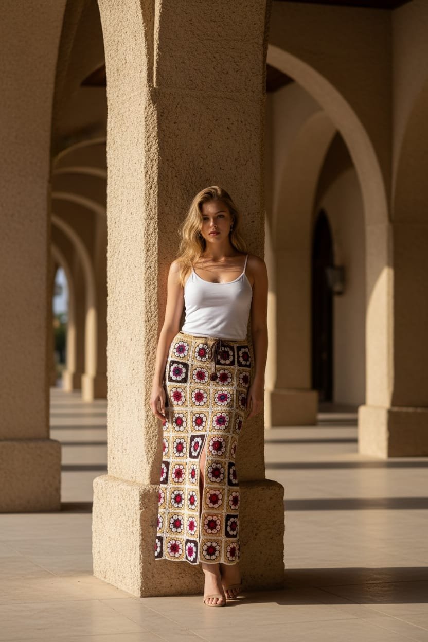 Bu el örgüsü granny square midi etek, retro kare motif tasarımı ve şık yırtmaç detayı ile hem günlük kombinlerde hem de özel günlerde fark yaratır.